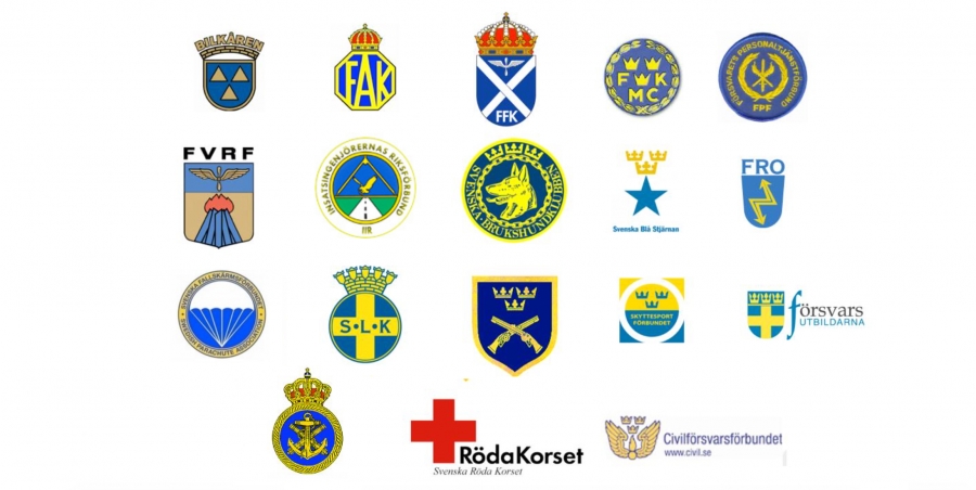 Svenska försvarsutbildningsförbundet, Insatsingenjörernas riksförbund, Flygvapenfrivilligas riksförbund, Frivilliga automobilkårernas riksförbund, Frivilliga flygkåren, Frivilliga motorcykelkårernas riksförbund, Frivilliga radioorganisationen, Försvarets personaltjänstförbund, Svenska blå stjärnan, Föreningen svenska röda korset, Riksförbundet Sveriges lottakårer, Sjövärnskårernas riksförbund, Svenska brukshundklubben, Svenska fallskärmsförbundet, Svenska pistolskytteförbundet, Svenska skyttesportförbundet, Sveriges civilförsvarsförbund, och Sveriges bilkårers riksförbund